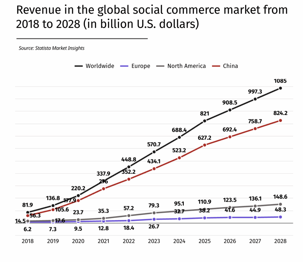 Les boutons d’achat n’ont jamais été aussi importants. Statista a estimé la taille du marché à 688 milliards de dollars en 2024, avec une projection à 1.000 milliards de dollars en 2028, soit près de 20% des ventes en ligne à cet horizon (contre 16,7% en 2024).