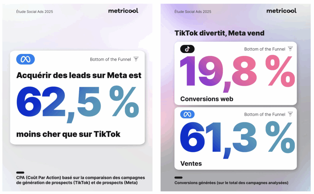 Et rien n’interdit, pour plus d’efficacité, de combiner plusieurs plateformes… Une étude de Metricool montre à ce sujet que TikTok sert prioritairement la visibilité et la considération, alors que Meta est devenu l’outil privilégié pour les conversions.