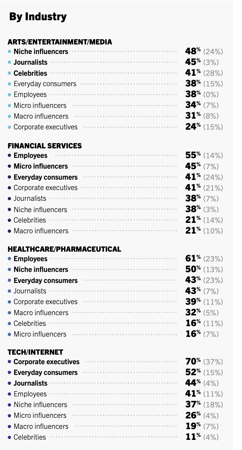 « Pour la première fois en huit ans d’histoire de cette étude, les employés occupent la première place parmi les influenceurs, indiquent les auteurs de l’étude. C’est également le cas dans les secteurs des services financiers et de la santé/pharma. »