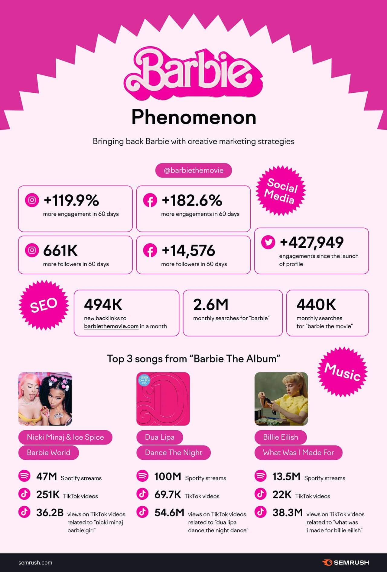 En jouant la carte de la nostalgie, notamment au travers de nouveaux comptes sur les réseaux sociaux, Barbie a su doper ses réseaux grâce au bouche-à-oreille, synonyme d’amplification organique. Et la campagne est également parvenue à d’excellents résultats en SEO, comme le montre cette infographie signée SEMRush.
