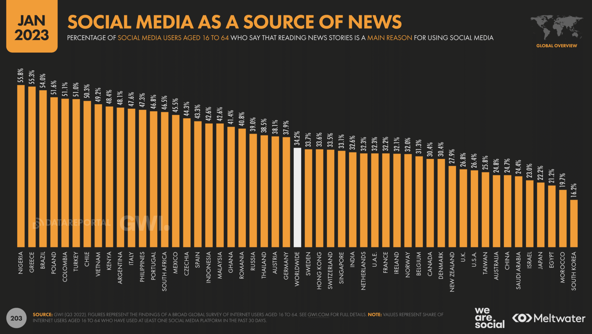 31,3% des Belges de 16 à 64 ans utilisent les réseaux sociaux comme sources d’infos, alors que la moyenne de l’étude s’élève à 34,2%.