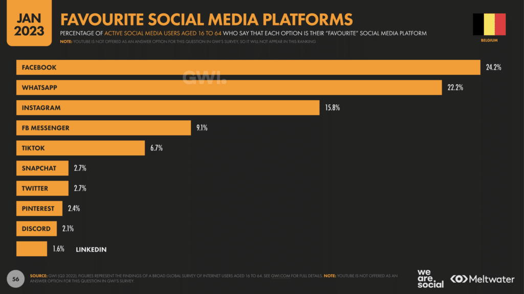 Les plateformes sociales « préférées », dans ce même échantillon, sont, en gros, celles qui sont les plus utilisées en Belgique. Donc celles de Meta ! Avec Instagram devant Messenger cette fois-ci.