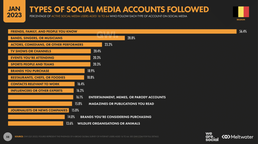 Ce tableau est cohérent avec le suivant, qui porte sur le type de comptes suivis sur les réseaux sociaux, toujours par les internautes belges de 16 à 64 ans.