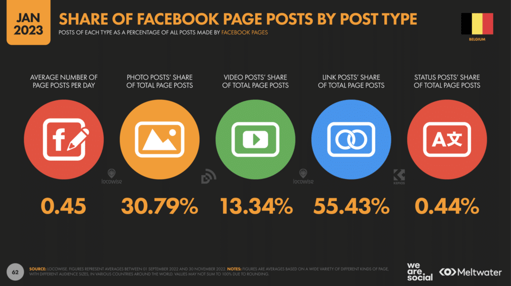 Sans surprise, le format de contenu le plus engageant sur Facebook en Belgique est la vidéo (taux d’engagement de 0,84% par rapport au nombre de « fans »), devant les photos (0,28%) et les textes seuls (0,22%). Les liens externes récoltent en moyenne, eux, un taux d’engagement sur followers de 0,08%… alors que c’est toujours le format le plus utilisé (55,43% des posts de pages), devant les photos (30,79%).