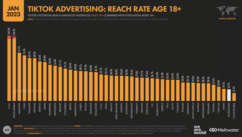 En séduisant 40,9% des Français.es de plus de 18 ans (les auteurs de l’étude de We Are Social / Meltwater n’ont pas accès aux données de TikTok pour les 13-18 ans, pourtant en nombre sur la plateforme), TikTok confirme son ascension en France. La filiale de ByteDance enregistrait en effet l’an dernier un taux de pénétration de 33,8%.