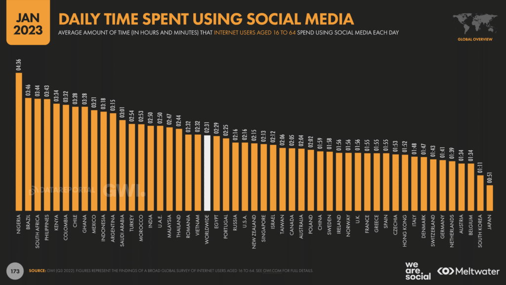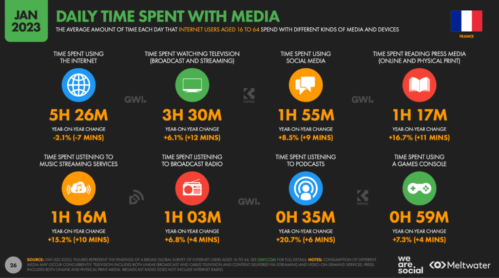 En moyenne, les internautes français.es âgés de 16 à 64 ans passent 1h55 par jour sur les réseaux sociaux, contre 1h46 l’an dernier, et alors que la moyenne de l’étude se situe à 2h31.