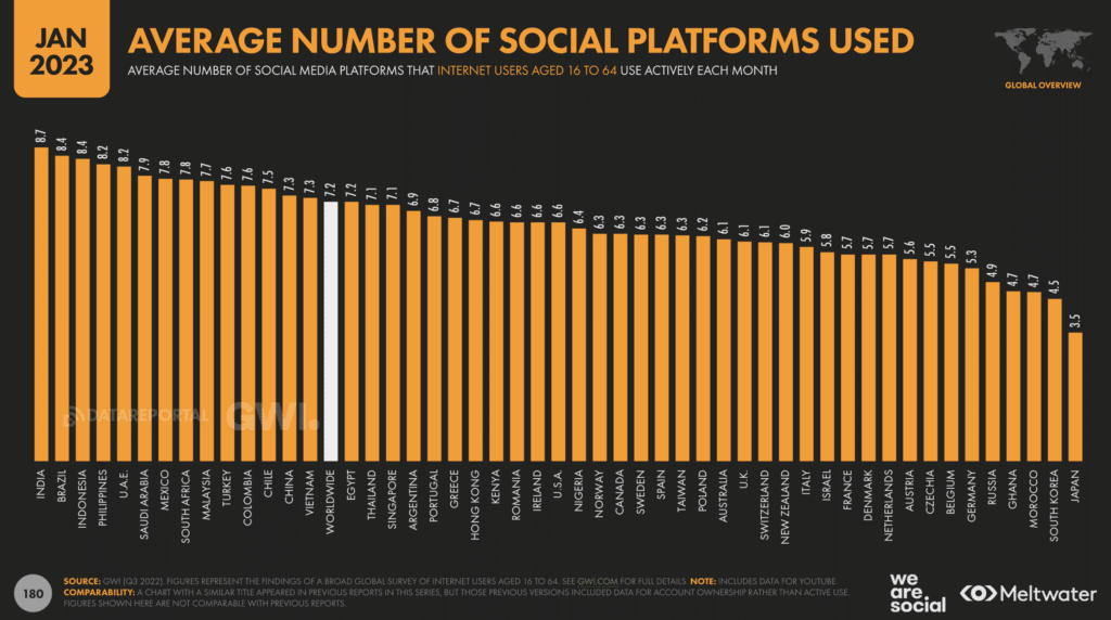 En moyenne, les internautes français.es âgé.e.s entre 16 et 64 ans possèdent à présent 5,7 comptes sur les réseaux sociaux, contre 5,5 en janvier 2022.