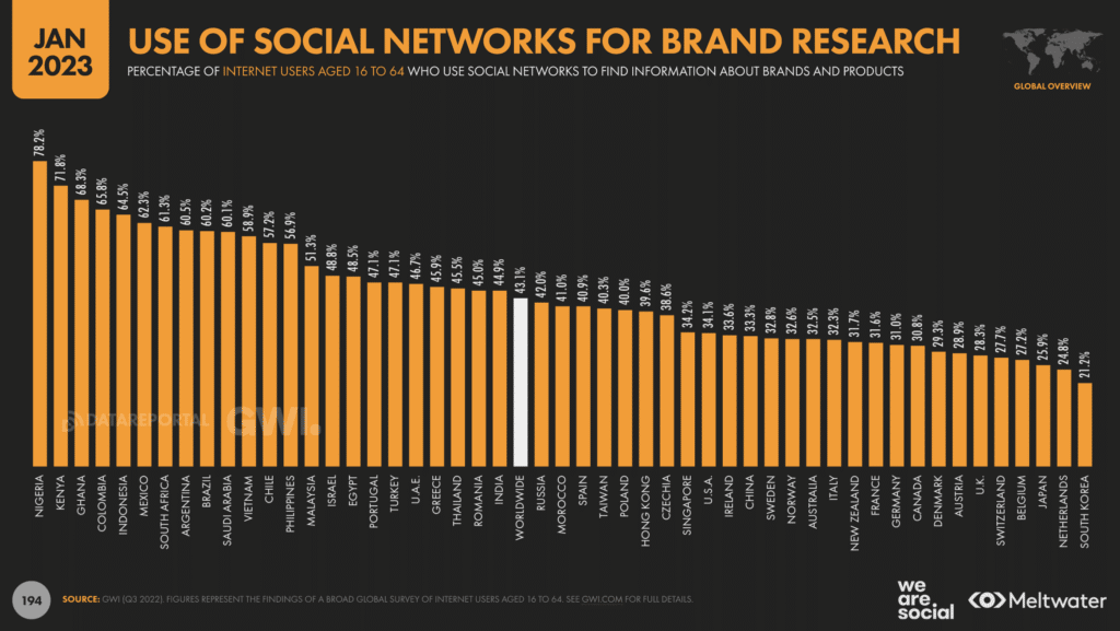 31,6% des internautes français.es de 16 à 64 ans se servent des réseaux sociaux pour rechercher des marques, alors qu’iels étaient 28,7% un an plus tôt et que la moyenne mondiale est à 43,1% (43,5% l’an dernier).