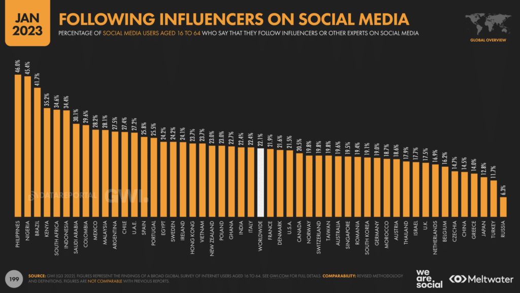 Enfin, pointons que les Français.es sont désormais 21,9% (vs 18,9% en janvier 2022) à suivre des influenceuses et des influenceurs sur les réseaux sociaux, alors que la moyenne mondiale atteint 22,1% (contre 22,6% l’an dernier).