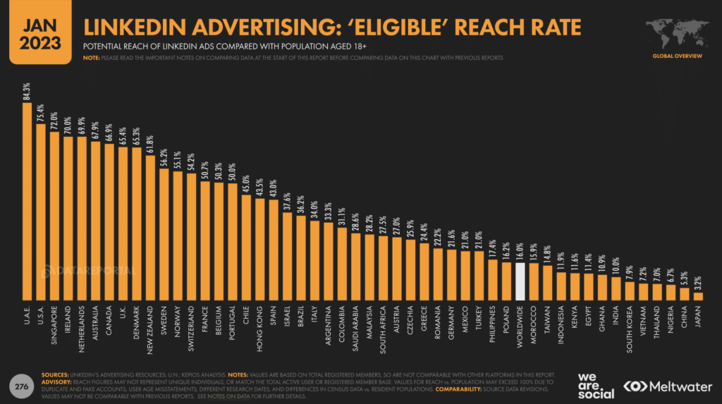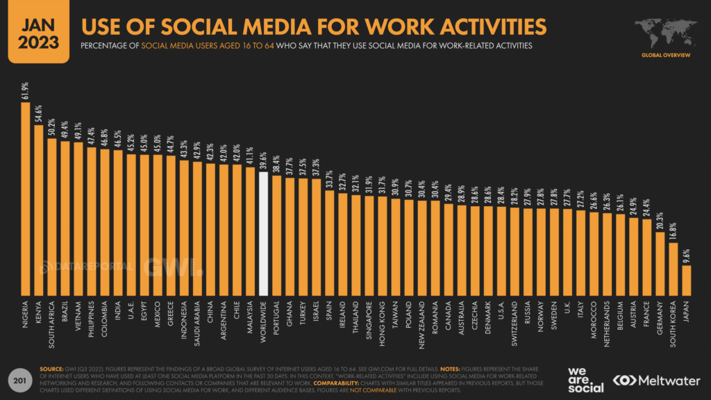 On notera que l’usage des réseaux sociaux à des fins professionnelles en France a atteint à 24,4% en 2022, très très loin de la moyenne de l’étude (39,6%), mais en très forte progression par rapport aux 10,9% de janvier 2022.