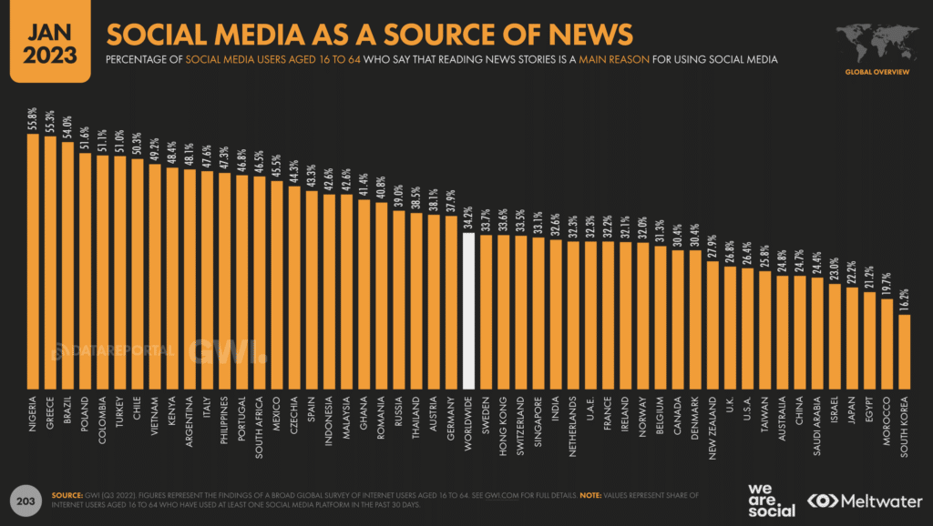32,2% des Français.es de 16 à 64 ans utilisent les réseaux sociaux comme sources d’infos, alors que la moyenne de l’étude s’élève à 34,2%.