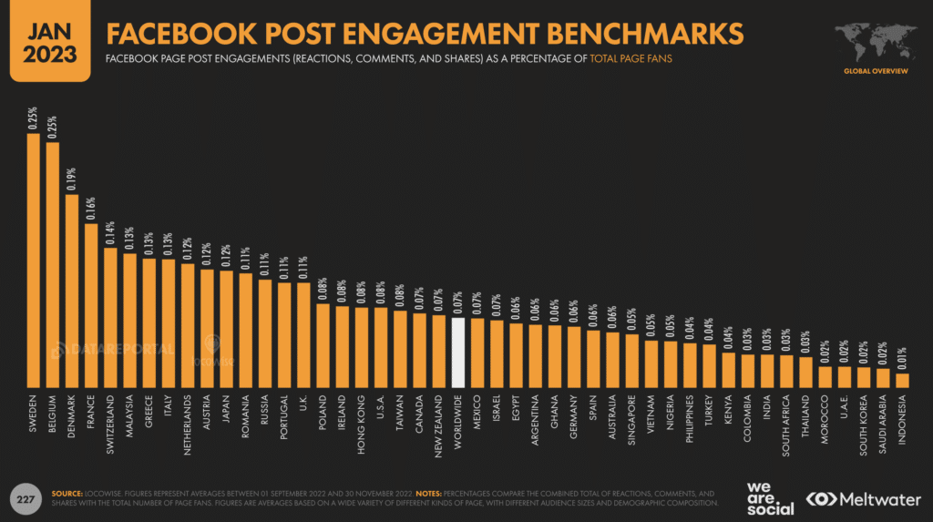 Le taux d’engagement des internautes français.es actif/ves sous les publications des pages Facebook se situe à 0,16% du nombre de followers, là où la moyenne mondiale atteint 0,07%.