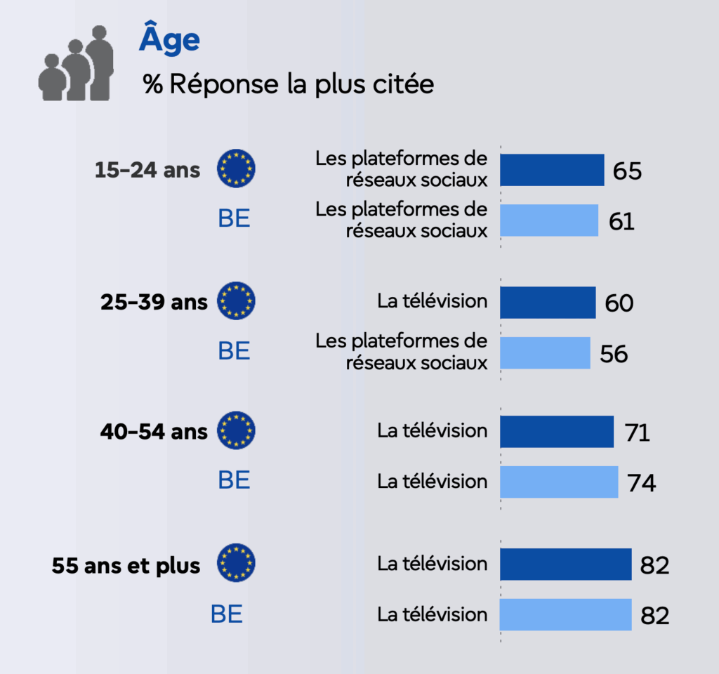 D’après l’édition 2025 du Flash Eurobaromètre, 65% des Belges de 15 à 24 ans déclarent s’informer sur les réseaux sociaux, contre 61% via la télévision. En 2023 : 66% citaient la TV, 59% les réseaux. En deux ans, la hiérarchie s’est donc renversée, même en Belgique, marquant le passage symbolique du journal télévisé au fil TikTok.