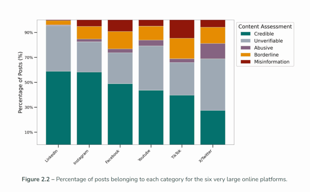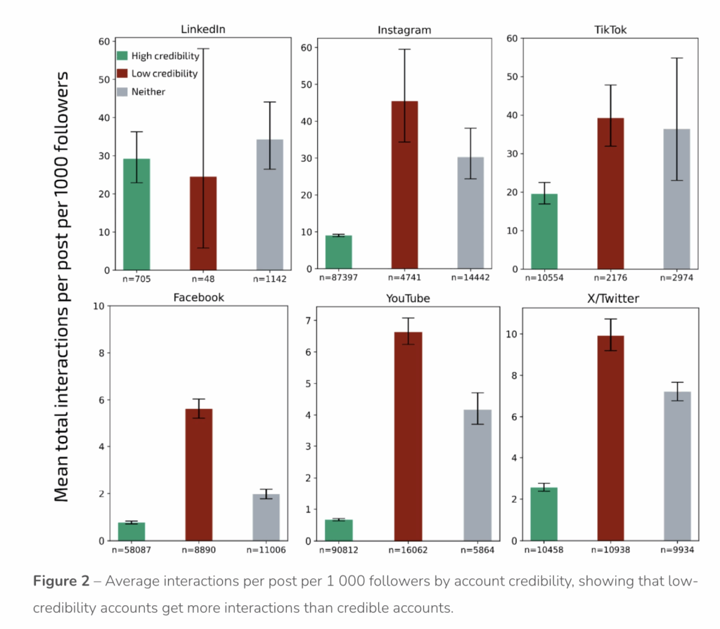 Autre constat majeur : sur toutes les plateformes, sauf LinkedIn, les contenus de faible crédibilité génèrent davantage d’interactions que les sources fiables. Jusqu’à huit fois plus sur YouTube, sept fois sur Facebook, cinq fois sur X et Instagram, deux fois sur TikTok.