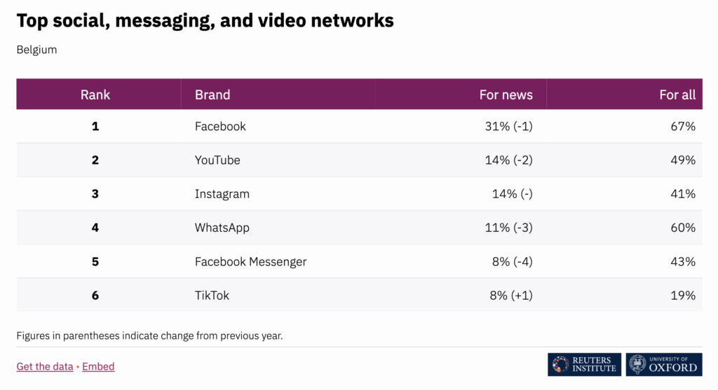 En Belgique, il y a un léger tassement de l’usage des réseaux sociaux pour s’informer (à part sur TikTok).