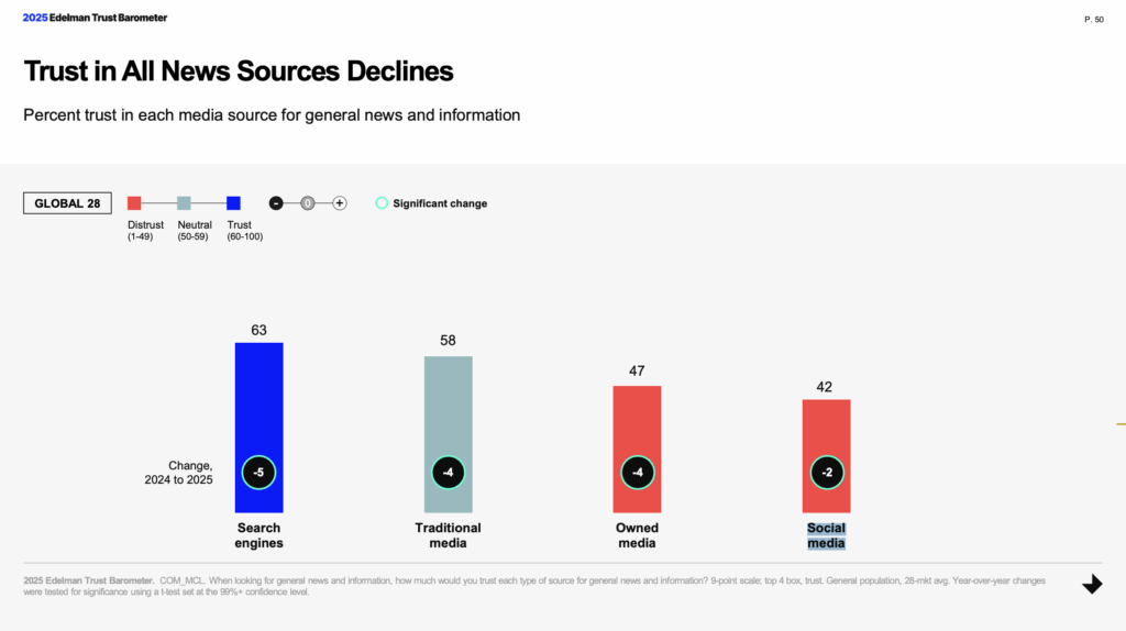 D’après le dernier Baromètre d’Edelman, qui souligne le caractère planétaire et global (toutes institutions confondues) de la crise actuelle de confiance, les réseaux sociaux sont toujours les pires sources d’infos, avec 42% d’indice de confiance, soit deux points de moins qu’il y a un an.