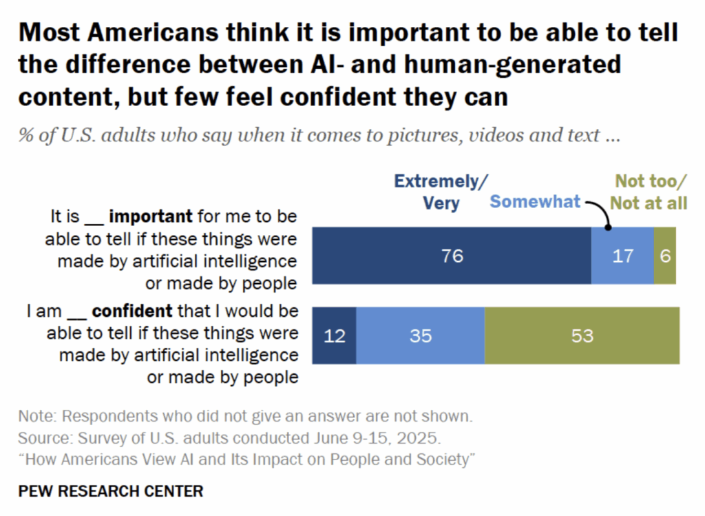 Selon le Pew Research Center, les adultes américains voudraient connaître l’origine d’un contenu, 76% jugent même essentiel que ces contenus soient clairement signalés… mais 53% se disent peu ou pas confiants dans leur capacité à déterminer si une image, une vidéo ou un texte ont été produits par IA.