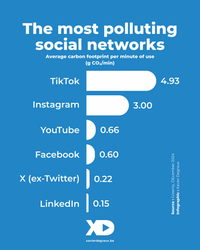 Une étude menée par Greenly évalue l’empreinte carbone moyenne d’une minute passée sur différentes plateformes.
