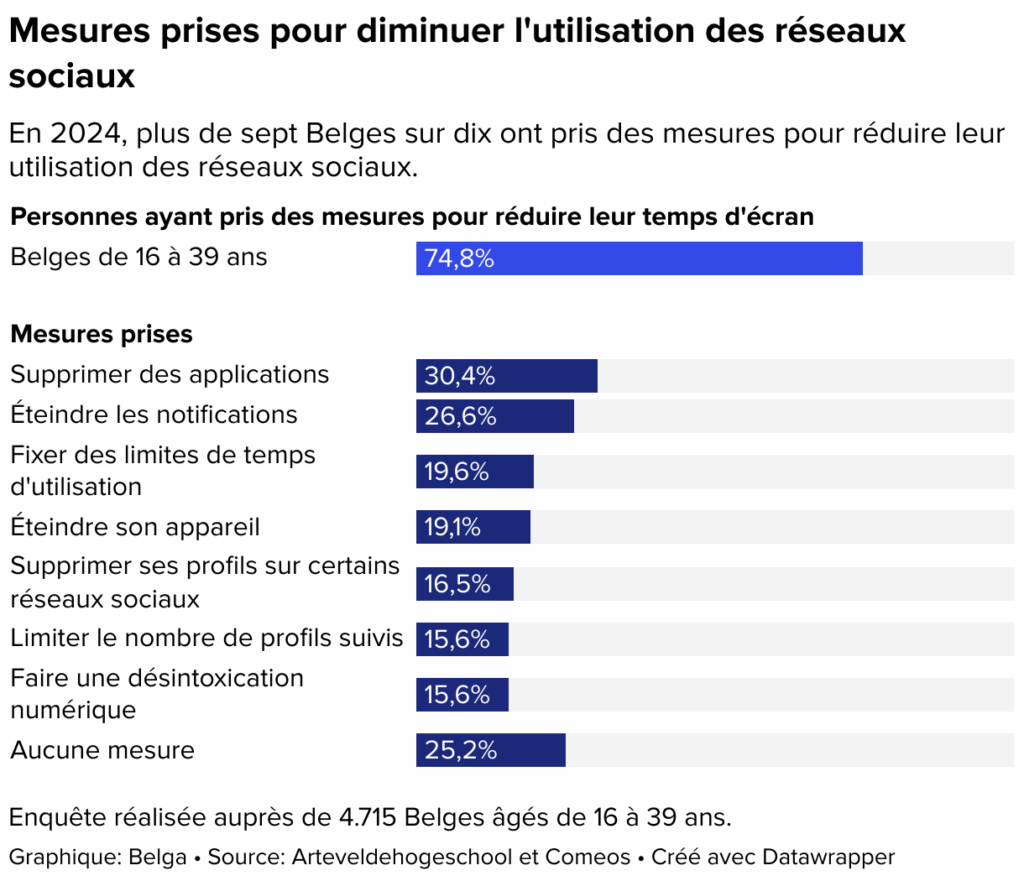 En Belgique, par exemple, un récent rapport sur les réseaux sociaux note que les 16-24 ans prennent des mesures concrètes : suppression d’applications, désactivation de notifications, réduction volontaire de certaines utilisations…