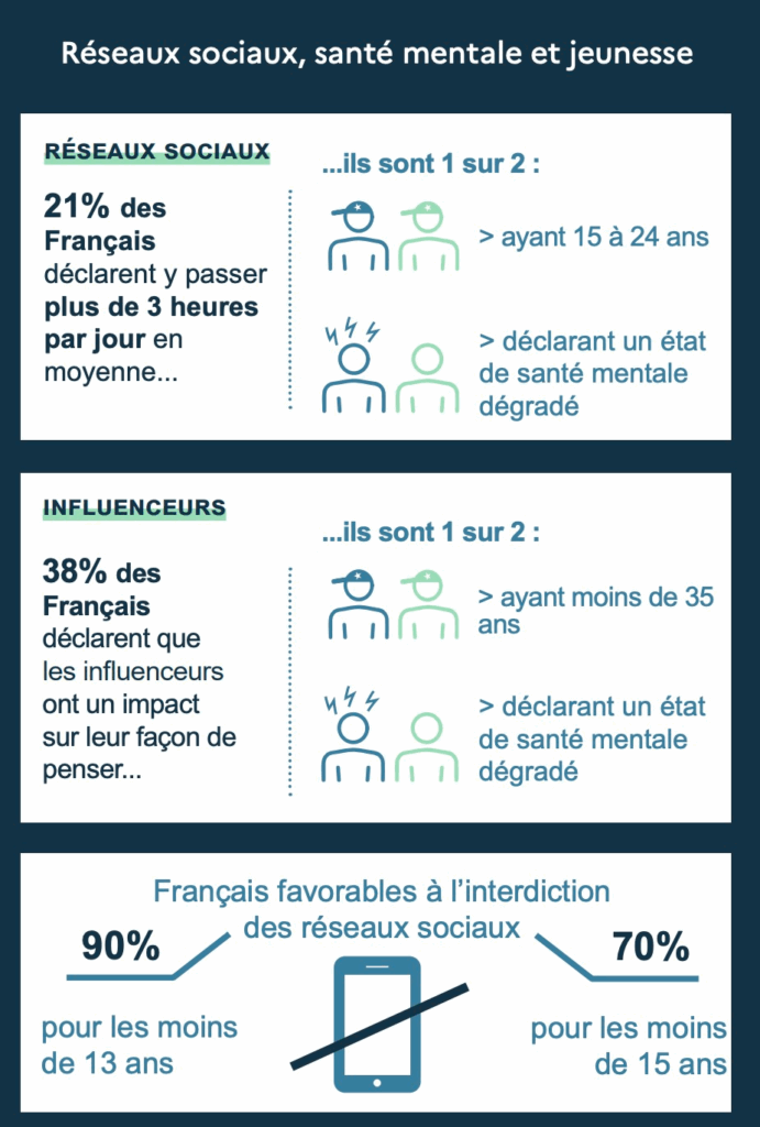 • 60% des 15-24 ans considèrent que les réseaux sociaux ont un impact négatif sur la société (même si ils sont pourtant 56% à les utiliser plus de 3 heures par jour).