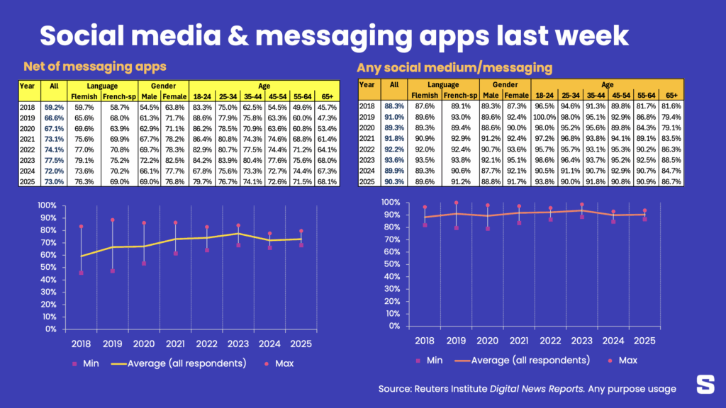 Et en Belgique, précisément ? Selon l’enquête du Reuters Institute, cité par l’agence Space (via MediaMarketing), l’usage des messageries (surtout WhatsApp et Messenger) a fortement progressé entre 2018 et 2023, passant de 59% à plus de 77% d’utilisation hebdomadaire (effet Covid ?), avant de légèrement redescendre à 73% en 2025 . La croissance stagne, mais ces outils sont devenus pleinement mainstream et utilisés de manière homogène dans la population.