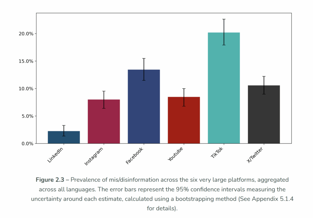 Les résultats, publiés à la fin du mois d’octobre, montrent que TikTok est la plateforme la plus exposée, avec 20,2% de contenus relevant de la désinformation, et jusqu’à 34% si l’on inclut les publications “borderline” ou “abusives”.