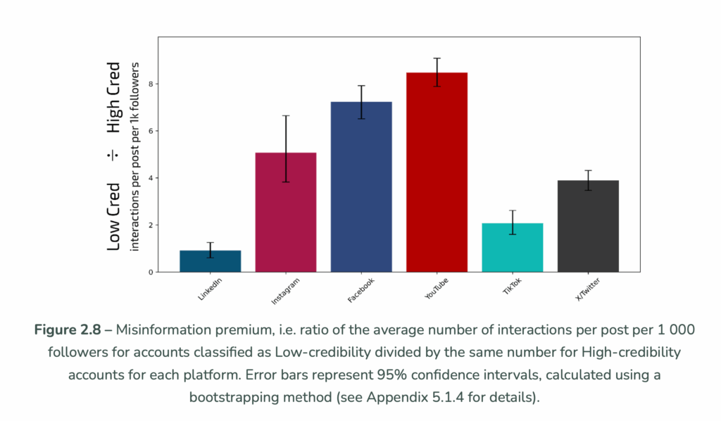 Sur toutes les plateformes, à l’exception de LinkedIn, les contenus de faible crédibilité génèrent davantage d’interactions que les sources fiables. Huit fois plus sur YouTube, sept fois sur Facebook, cinq fois sur X et Instagram, deux fois sur TikTok.