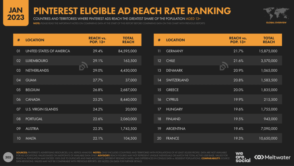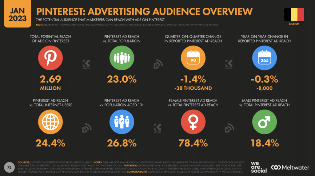 Na een jaar van daling heeft Pinterest zijn penetratiegraad in België (5e wereldwijd!) min of meer gehandhaafd, met een bereik van 2,69 miljoen Belgen (-0,3%), d.w.z. 26,8% van de bevolking ouder dan 13 jaar, tegenover 2,7 miljoen vorig jaar.