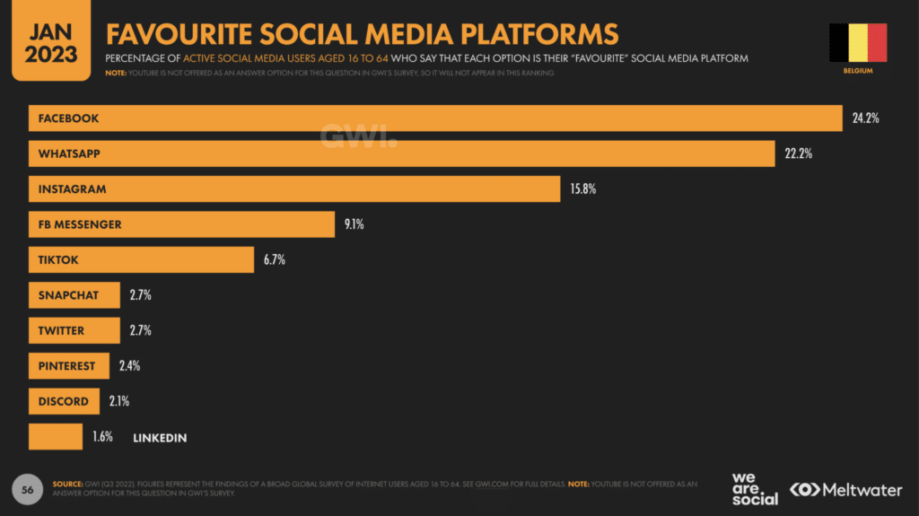 De ‘favoriete’ sociale platforms in diezelfde steekproef zijn, grosso modo, de platforms die in België het meest gebruikt worden. Die van Meta dus! Met Instagram deze keer voor op Messenger.