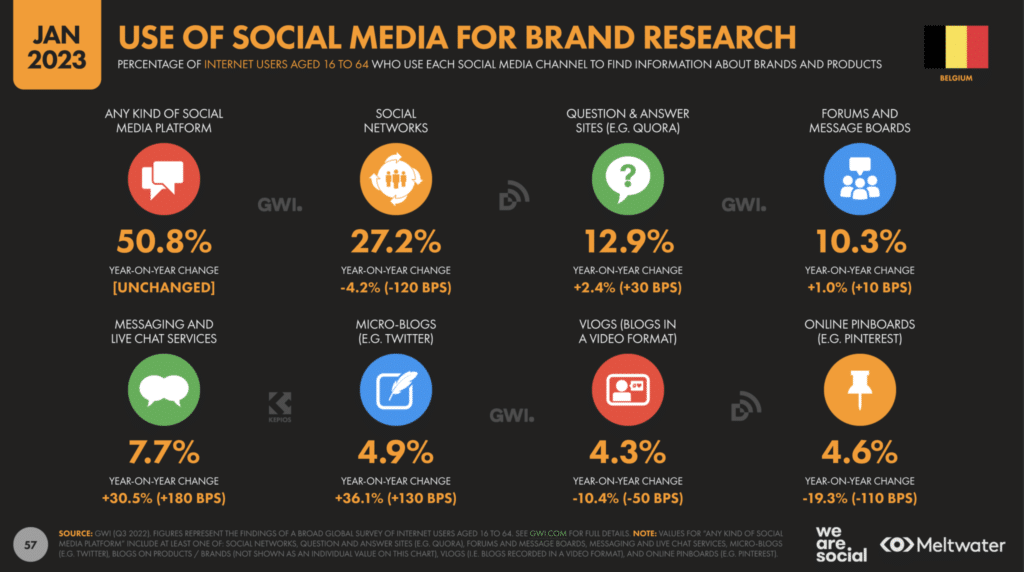 27,7% van de Belgische internetgebruikers tussen 16 en 64 jaar gebruikt sociale netwerken om naar merken te zoeken (tegenover 29% vorig jaar), tegenover 43,1% wereldwijd (43,5% in 2022).