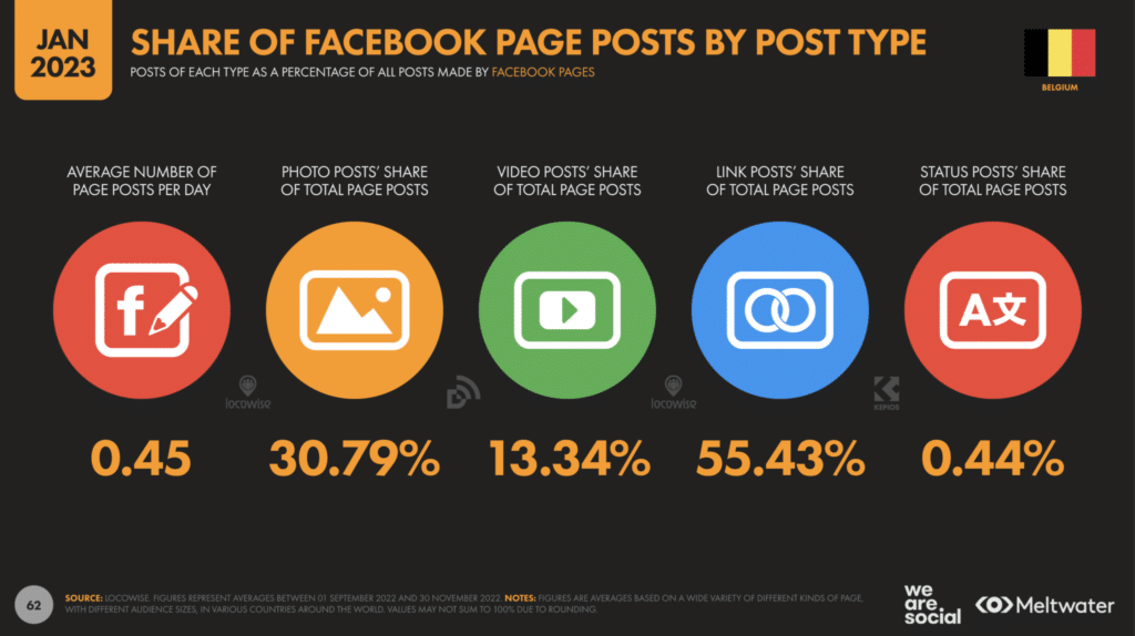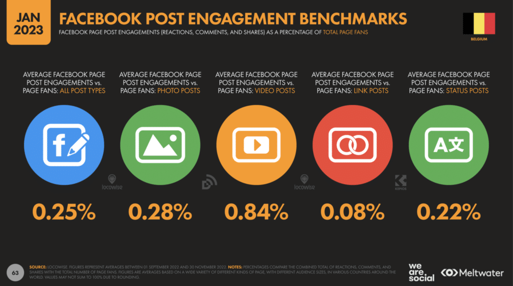 Het engagementpercentage van Belgische internetgebruikers die actief zijn onder de publicaties van Facebookpagina’s is sterk gestegen tot 0,25% van het aantal volgers (tegenover 0,08% in 2022), terwijl het wereldwijde gemiddelde 0,07% bedraagt.