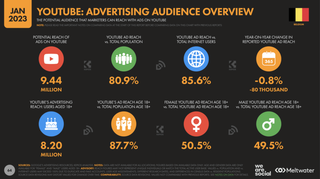 YouTube, waarvan de status als « sociaal netwerk » nog 107 jaar ter discussie staat, heeft in België een grote voorsprong op de sociale netwerken, met een totaal reclamepubliek van 9,44 miljoen Belgen (-0,8% op een jaar), waarvan 50,5% vrouwen. De penetratiegraad bij Belgen ouder dan 18 jaar bedraagt 87,7%.