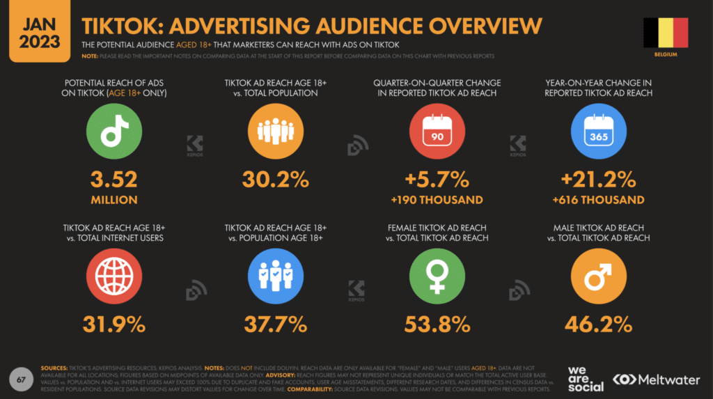 Door 37,7% van de Belgen boven de 18 jaar aan te trekken, oftewel 3,52 miljoen Belgen boven de 18 jaar (opmerking: de auteurs van de We Are Social / Meltwater studie hebben geen toegang tot TikTok gegevens voor 13-18 jarigen, ook al zijn er veel op het platform), heeft TikTok zijn opmars in België bevestigd. Vorig jaar had de ByteDance-dochter een aandeel van 31,3% in de leeftijdsgroep 18+.