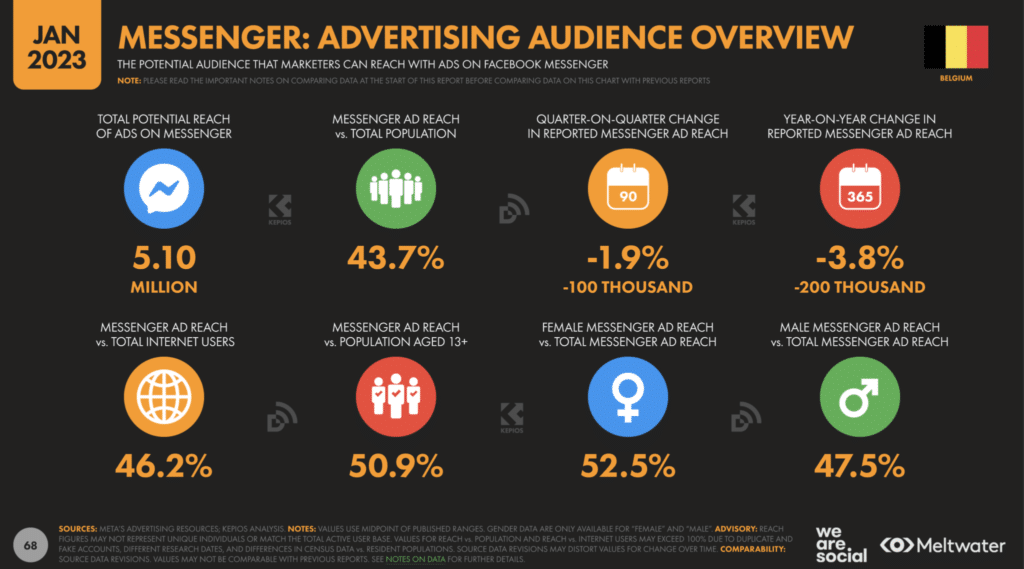 Er zij op gewezen dat Messenger, de instantberichtendienst die rechtstreeks aan Facebook is gekoppeld, 50,9% van de Belgen ouder dan 13 jaar aantrekt (-3,8% in één jaar), d.w.z. 5,1 miljoen personen. Daarvan is 52,5% vrouw.