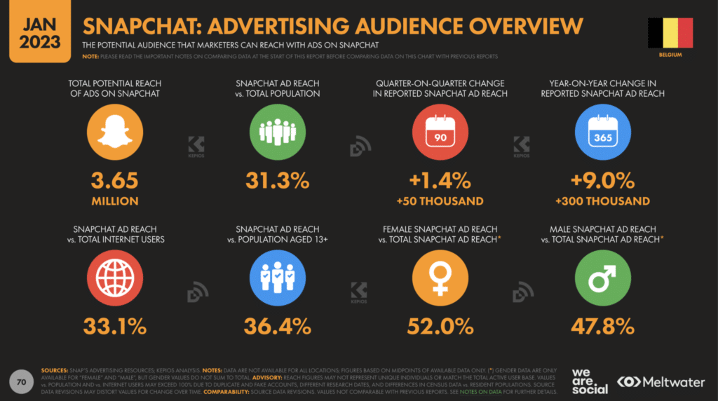 Ook Snapchat blijft groeien en beweert aanwezig te zijn in het leven van 36,4% van de Belgen ouder dan 13 jaar, d.w.z. 3,65 miljoen personen (waarvan 52% vrouwen), tegenover 33,7% in januari 2022 (+9%) en 32,8% een jaar eerder.