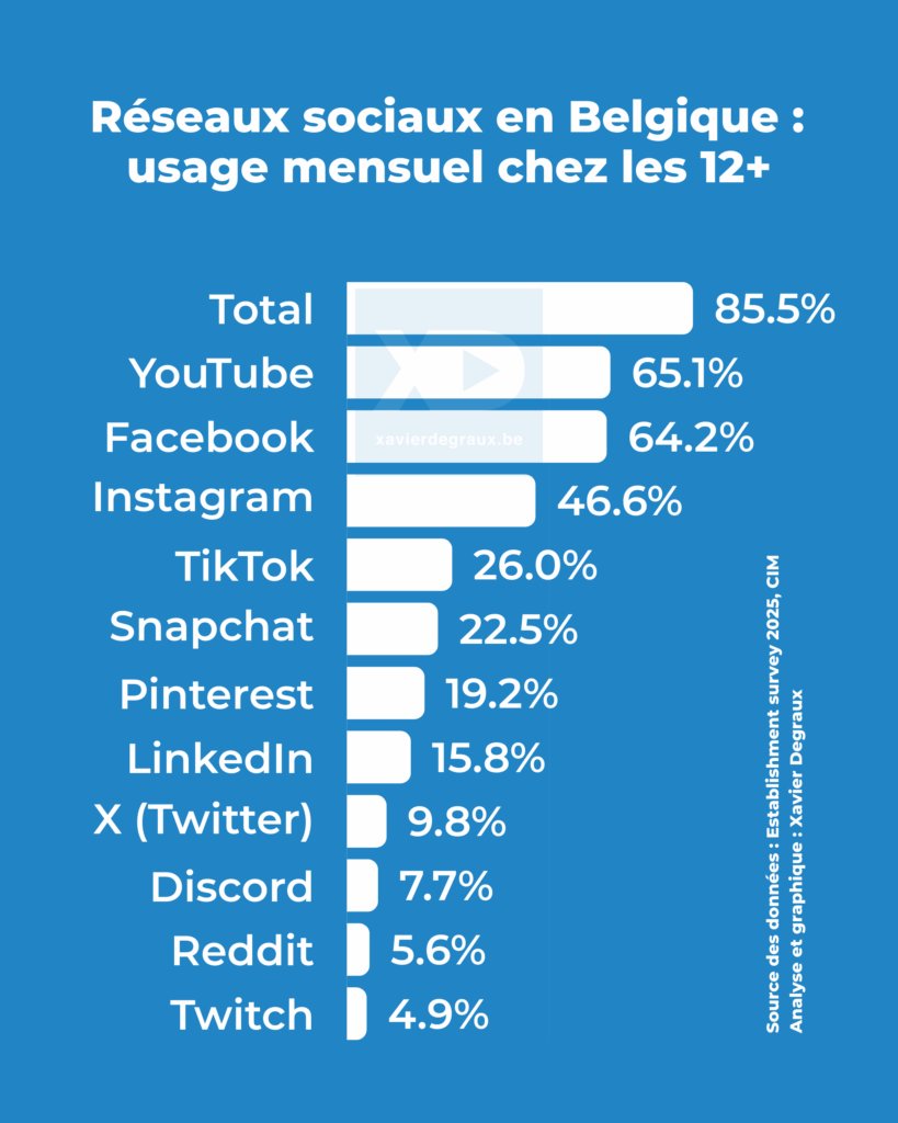 Bref, si la portée globale des réseaux se stabilise en Belgique (à 85,5% des 12+), elle se concentre sur un duopole durable : YouTube pour la vidéo et la recherche/découverte, Facebook pour la diffusion large multi-âges.