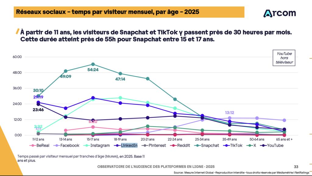 D’après l’Observatoire de l’audience des plateformes en ligne 2025 de l’Arcom, LinkedIn enregistre une moyenne de 16,5 millions de visiteurs uniques mensuels en 2025. Soit 6% de moins que 3 ans plus tôt, en 2022.